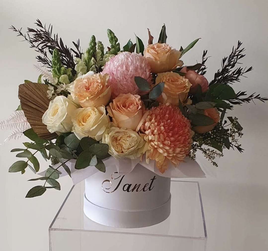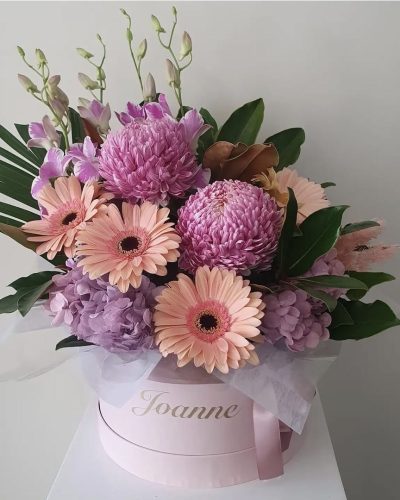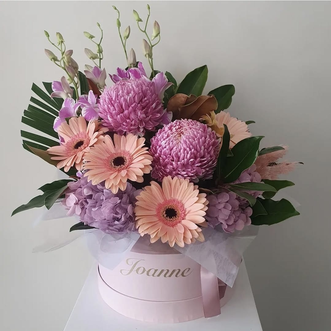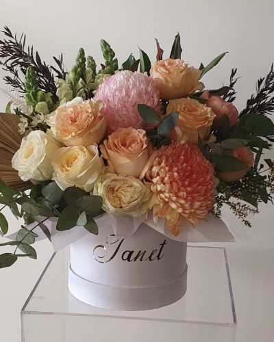 Singapore Pot $65 Singapore Box $80 Includes personalisation Adelle $120Vase Included Native beauty $120 Olivia $70 Analise $90 Mia $50Small box arrangement Addison $50Small posy-vase not included Sophia $85 Balloon and personalised box Included Isabella $65 Marie $90Personalising Included Alexia $130Personalising Included Charlotte $75 Preserved Beauty $80 Amelia $90 Sabrina $260 24 long stem roses in a ceramic Vase Elisabeth $90Ceramic Pot Noel $90Vase Included Josephine $120 Birthday Surprise $90 Balloon included Lucy Lou $150 Ocean Song $180 Eva $80 Juliette $150 Preserved and fresh flowers in a large personalised box Stephanie $100 Elle $19035-45 roses in a personalised box Birthday bliss $150 Precious pinks $150Vase included Florist Choice flowers & Vase $150 Joanne $100